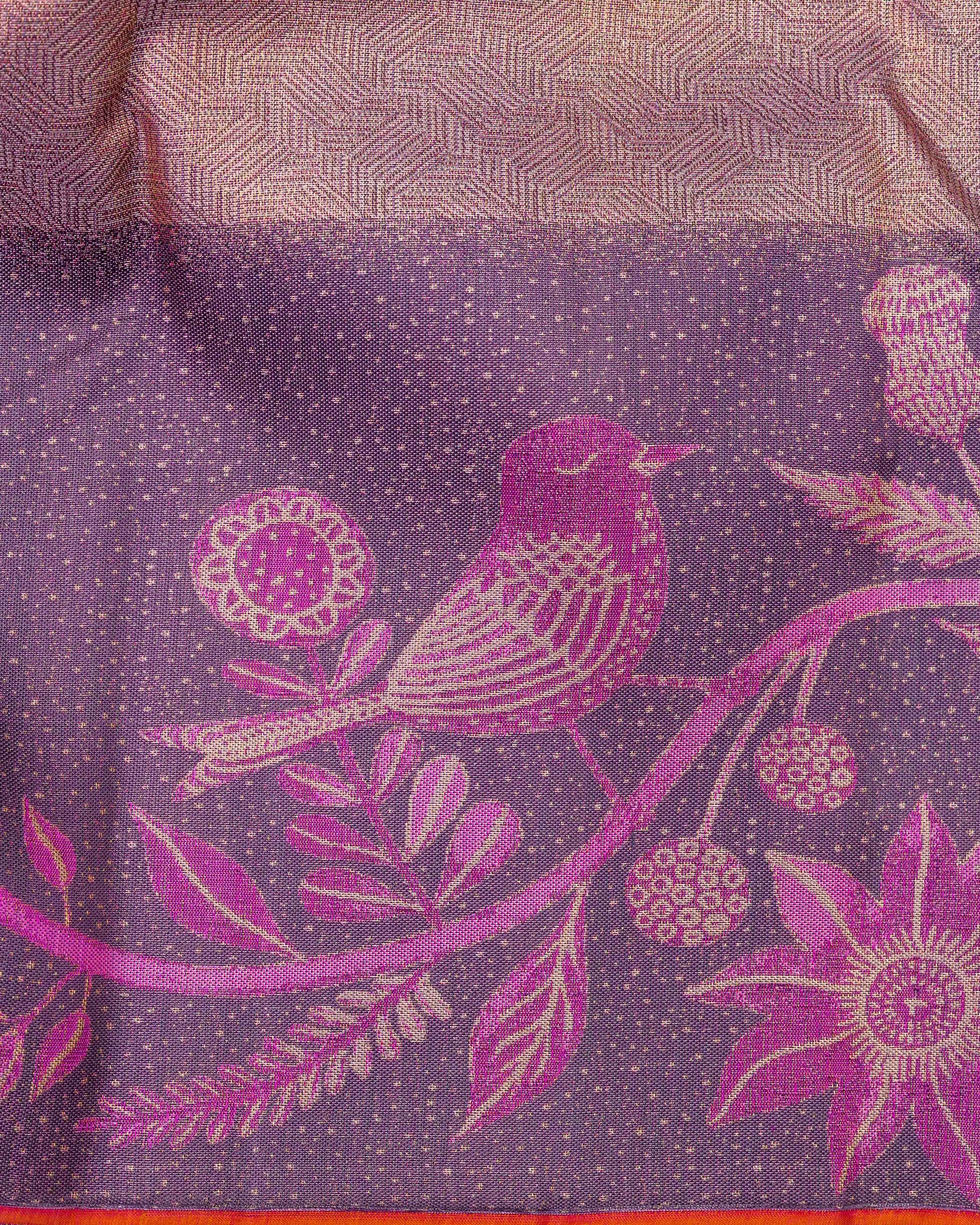 • ZARI TISSUE GEOMENTRICAL SELF DISEGN WITH FLOWER, SPRROW MEENA BORDER.          • 6.25 METRES