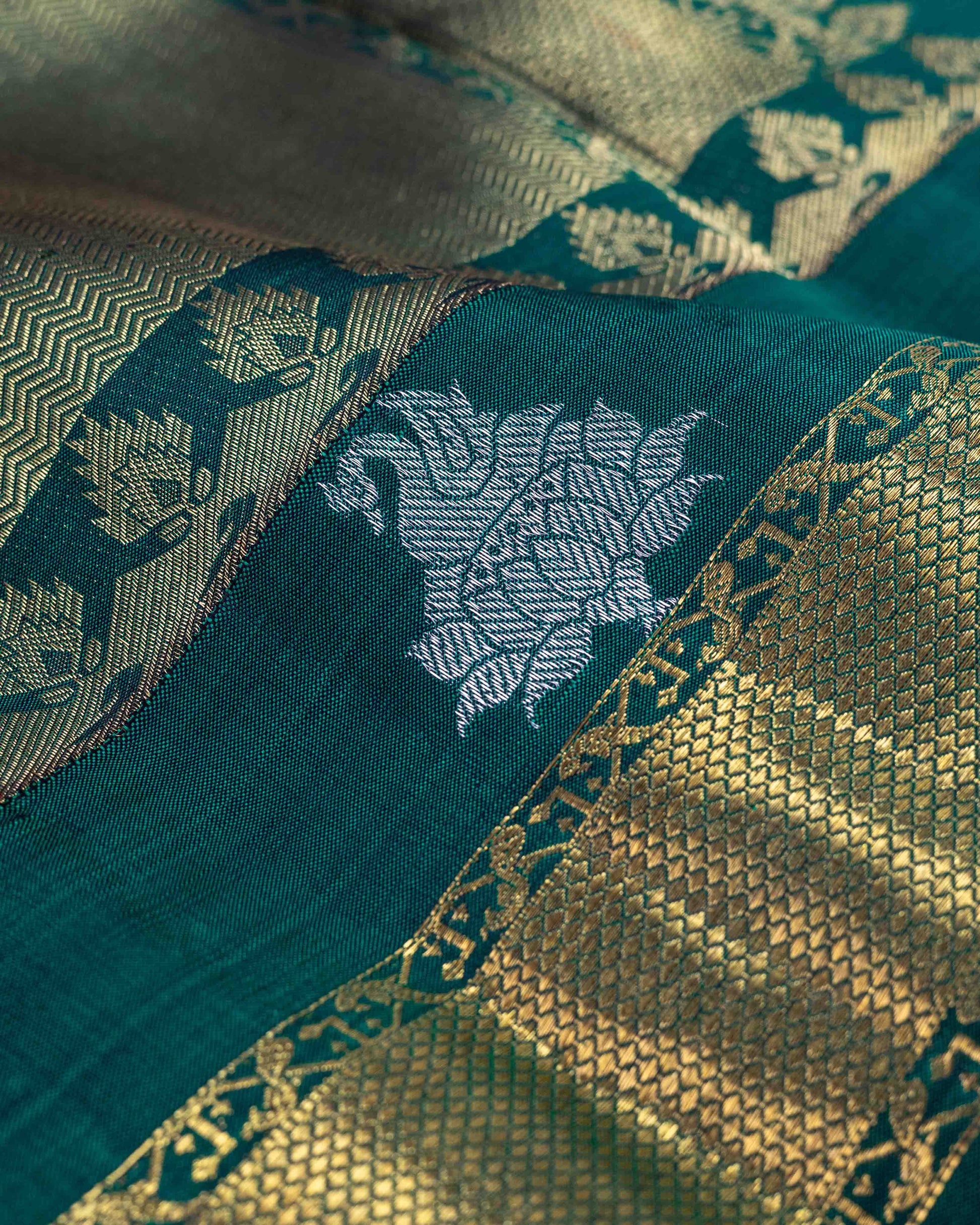 • INTRICATE FULL BODY ZARI WOVEN CRAFTMANSHIP.